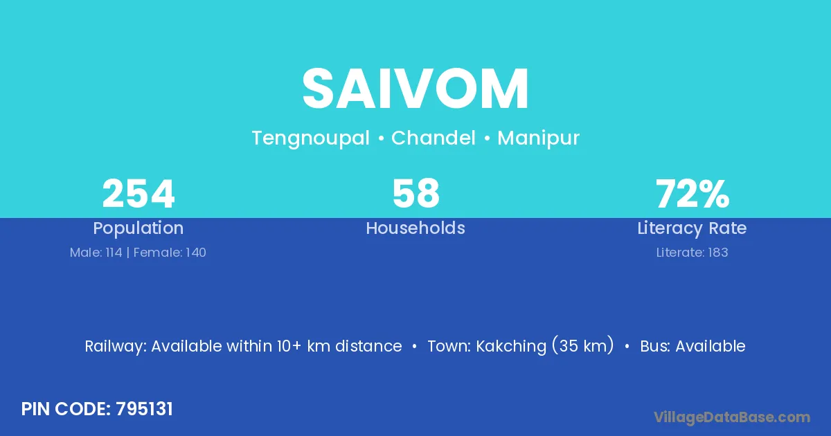Kakching (35 km) is the nearest town to Saivom village for major economic activities and is located approximately 35 km away.
