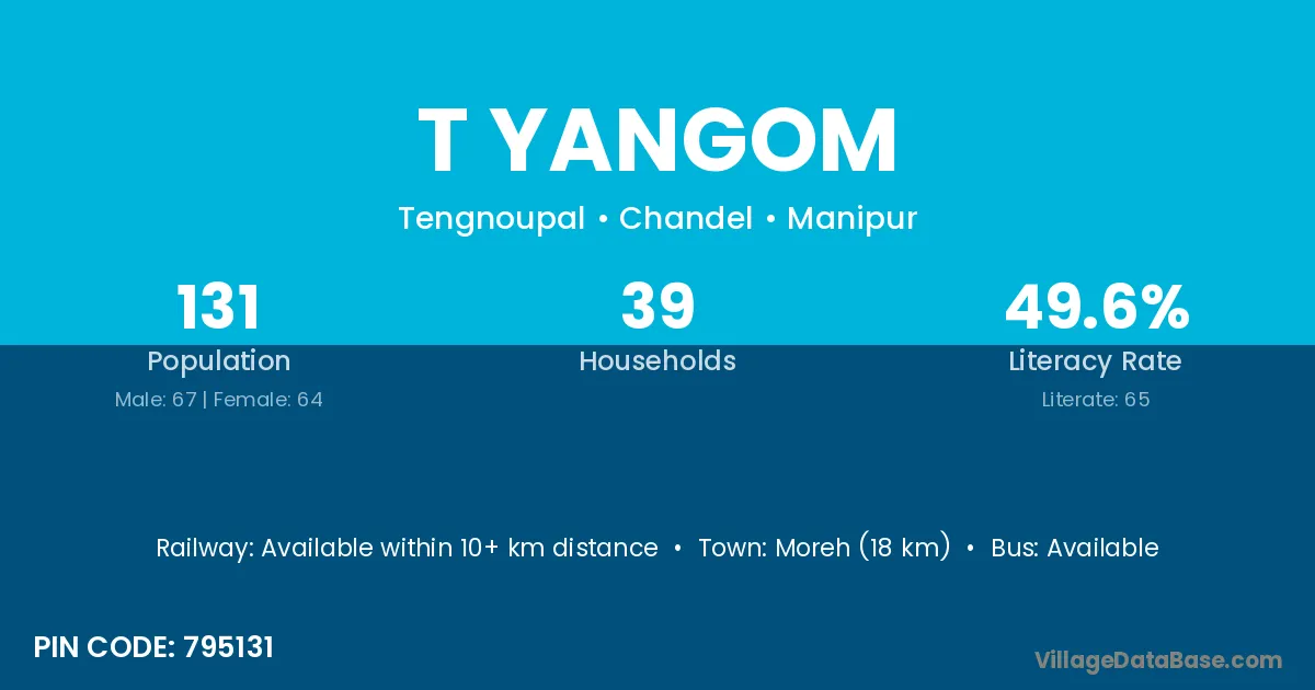 Moreh (18 km) is the nearest town to T Yangom village for major economic activities and is located approximately 18 km away.