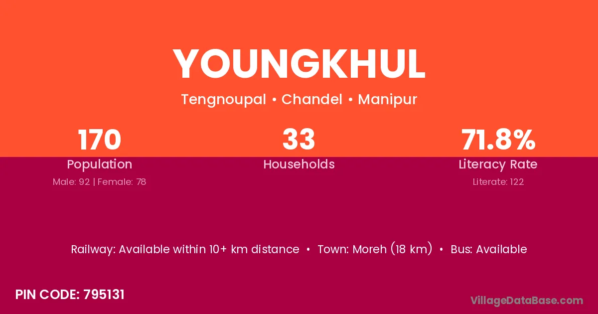 Moreh (18 km) is the nearest town to Youngkhul village for major economic activities and is located approximately 18 km away.