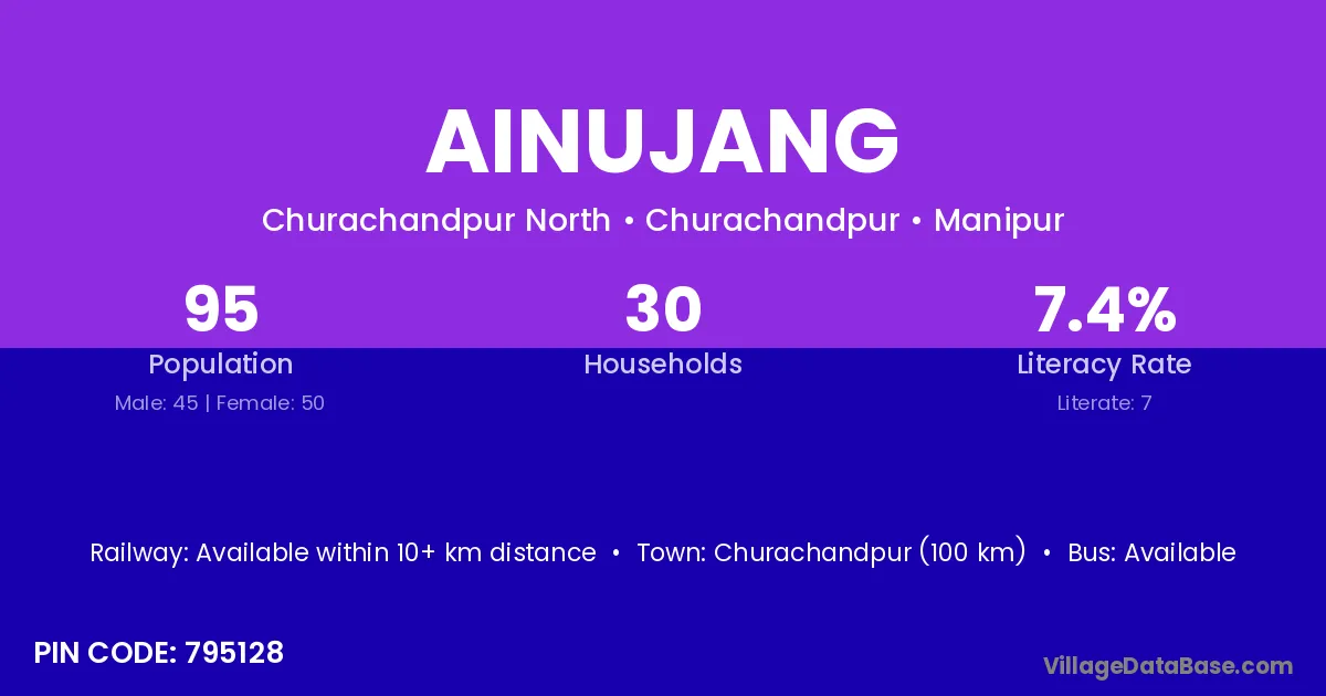 Churachandpur (100 km) is the nearest town to Ainujang village for major economic activities and is located approximately 100 km away.