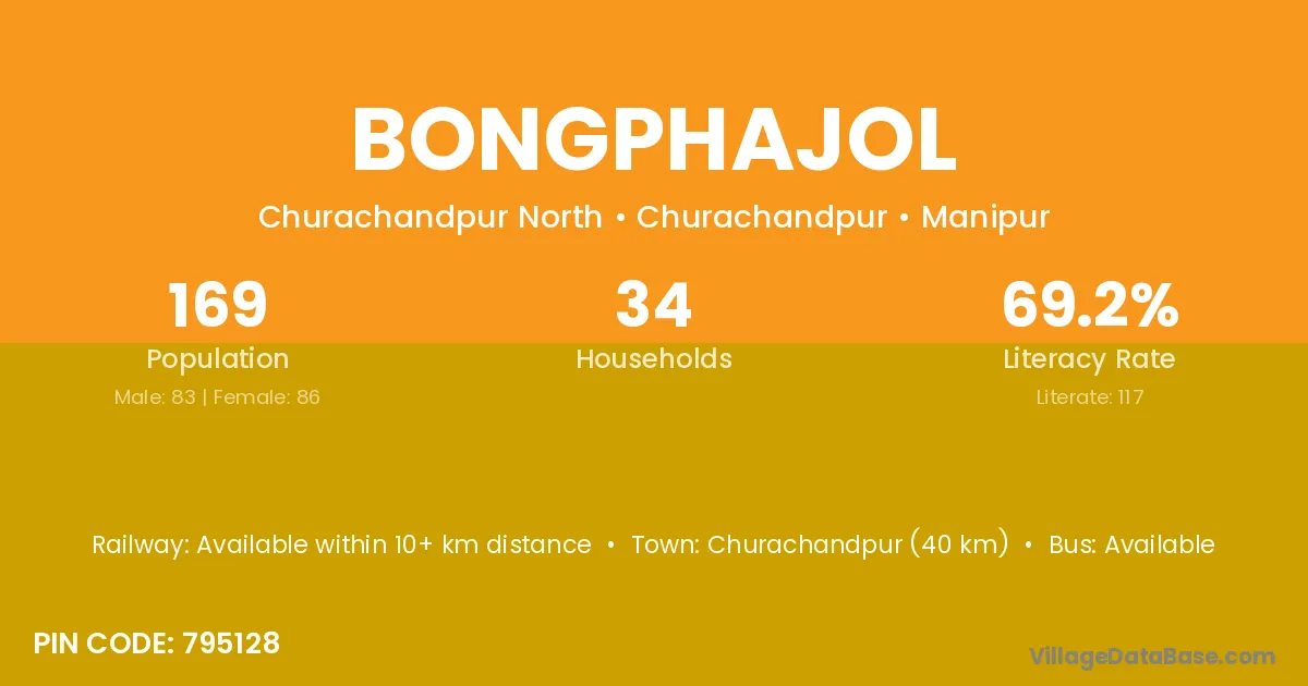 Churachandpur (40 km) is the nearest town to Bongphajol village for major economic activities and is located approximately 40 km away.