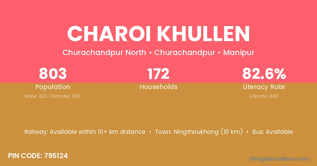 Ningthoukhong (10 km) is the nearest town to Charoi Khullen village for major economic activities and is located approximately 10 km away.