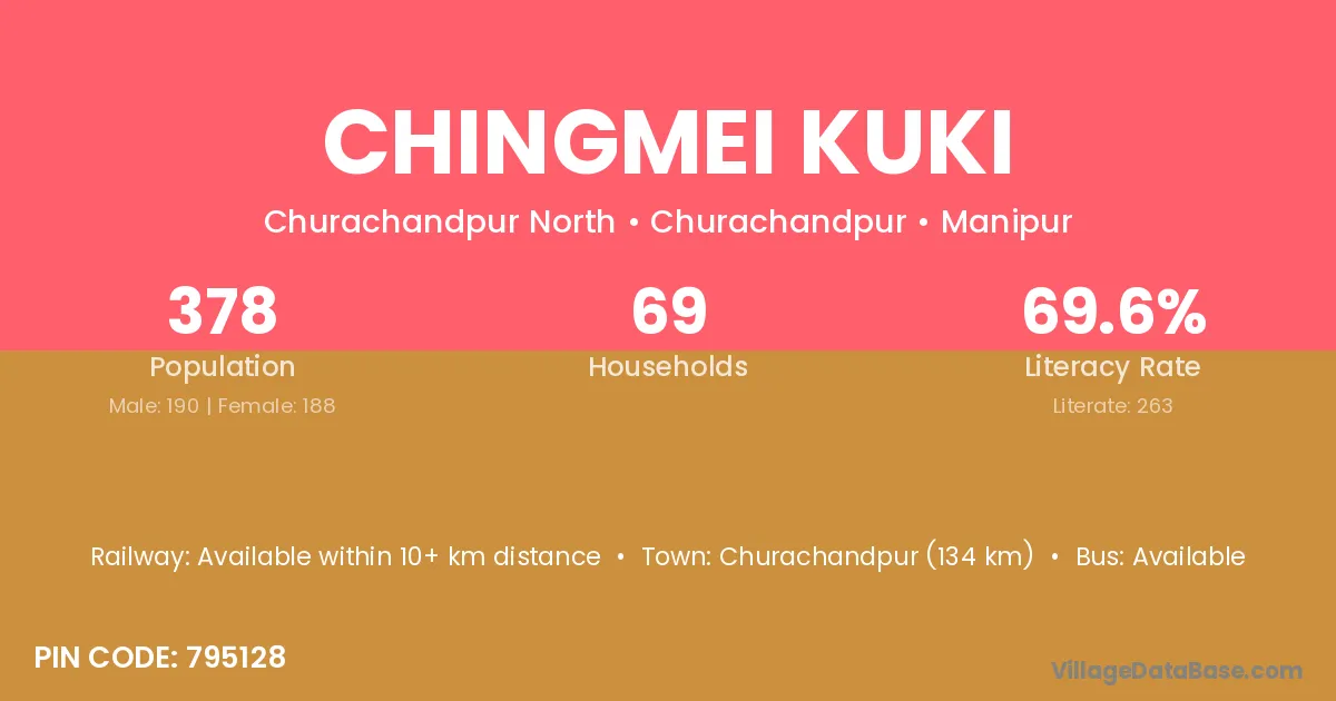 Chingmei Kuki village has a total population of 378 people, of which 190 are males and 188 are females.