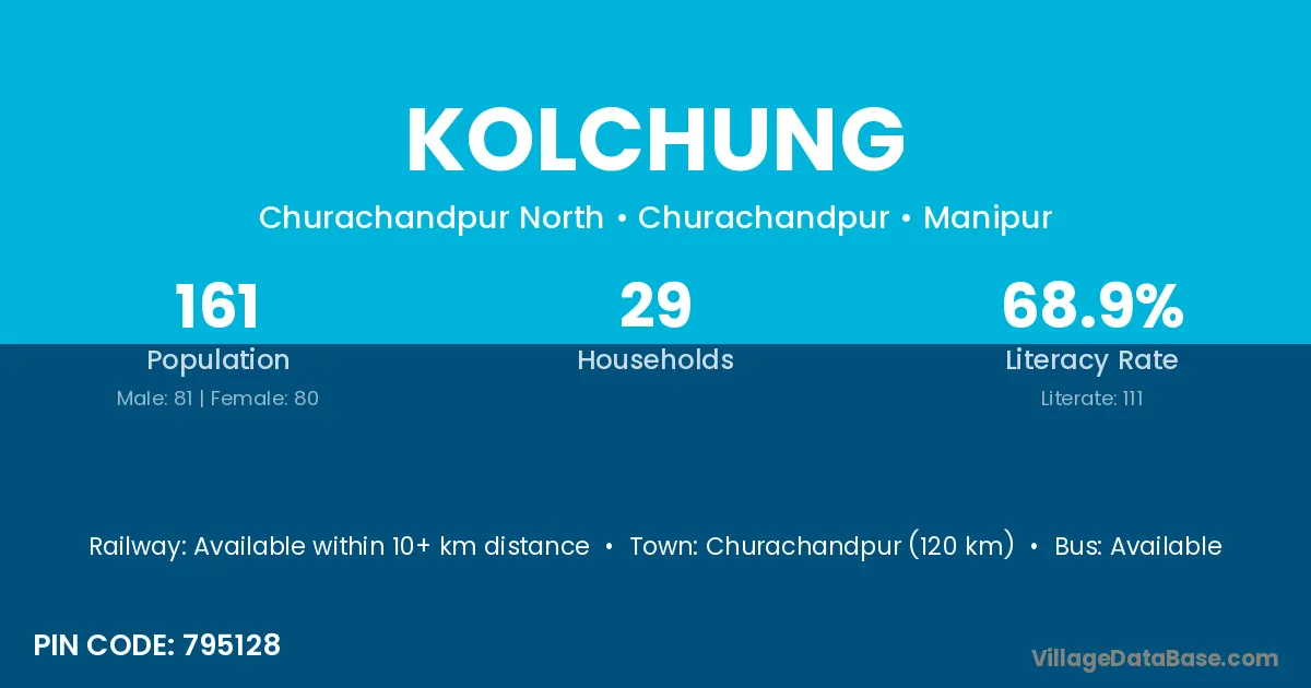 Churachandpur (120 km) is the nearest town to Kolchung village for major economic activities and is located approximately 120 km away.