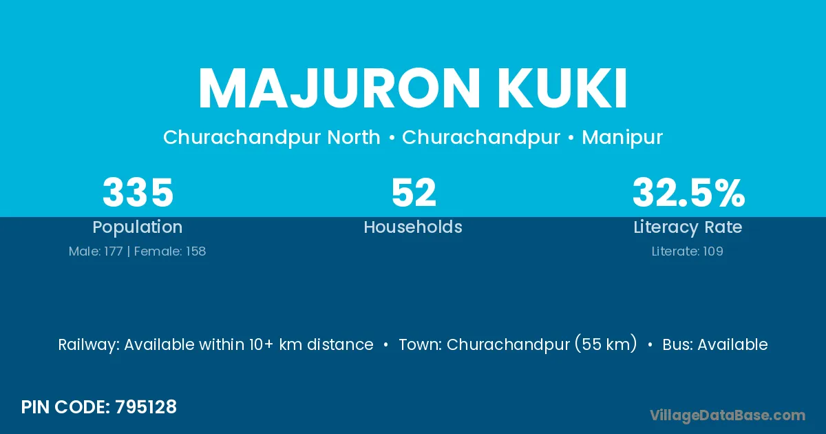 Churachandpur (55 km) is the nearest town to Majuron Kuki village for major economic activities and is located approximately 55 km away.