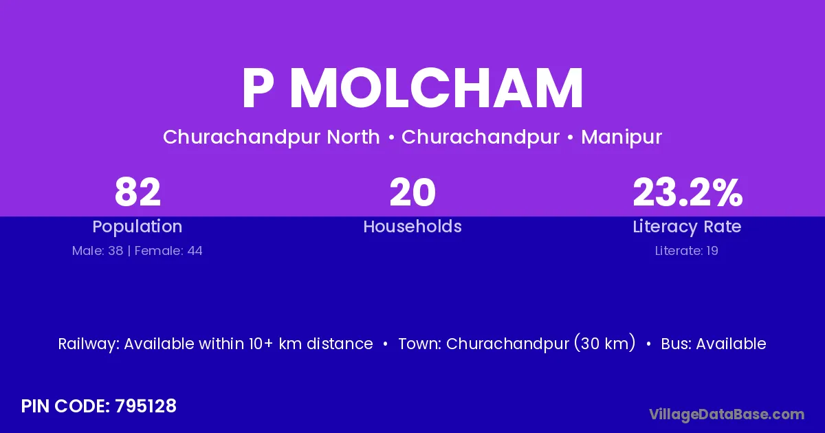 Churachandpur (30 km) is the nearest town to P Molcham village for major economic activities and is located approximately 30 km away.