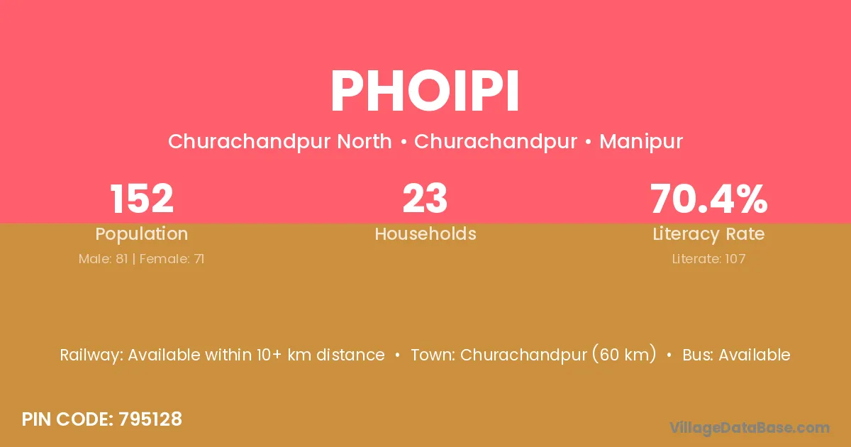 Churachandpur (60 km) is the nearest town to Phoipi village for major economic activities and is located approximately 60 km away.