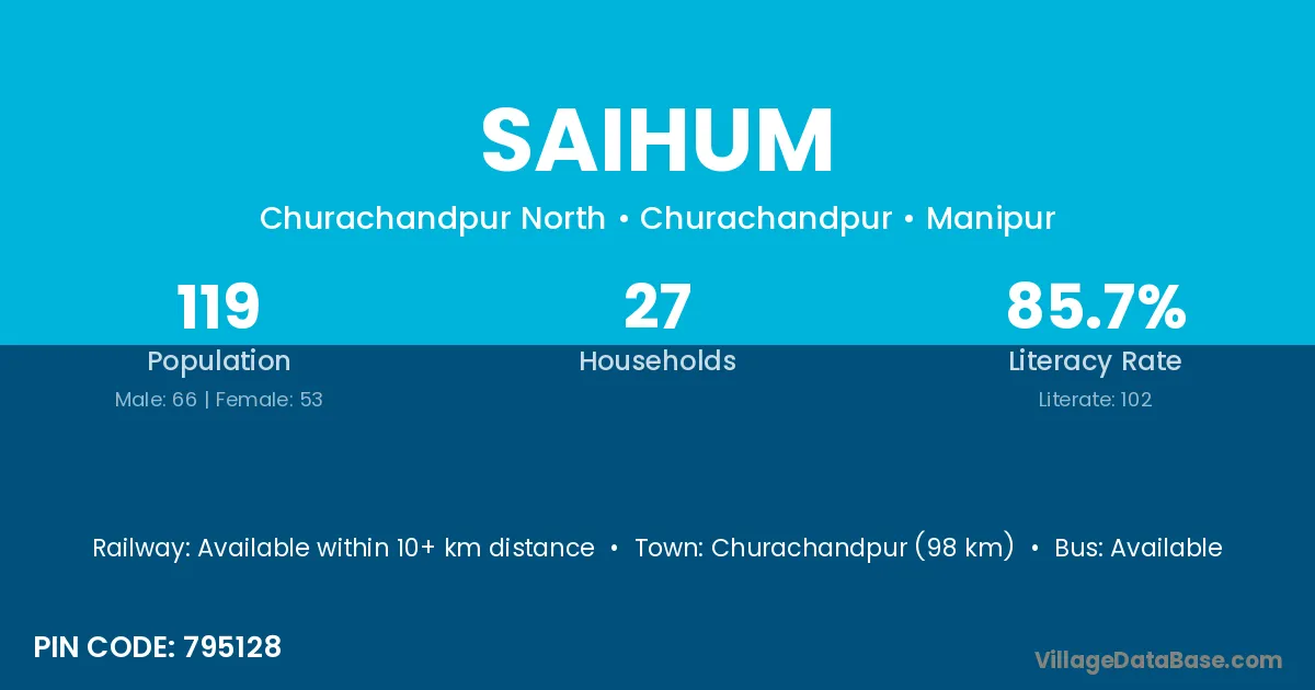 Churachandpur (98 km) is the nearest town to Saihum village for major economic activities and is located approximately 98 km away.