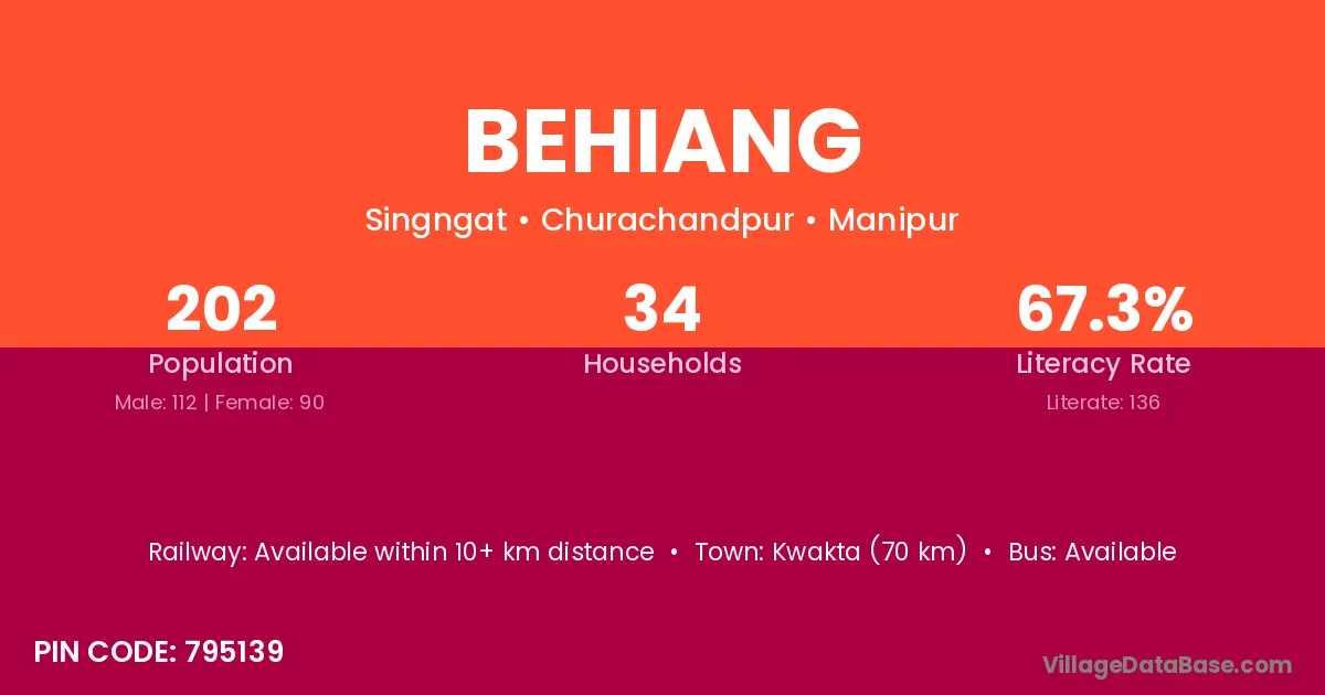 Behiang village has a total population of 202 people, of which 112 are males and 90 are females.