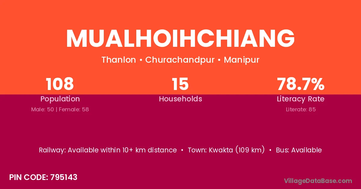 Kwakta (109 km) is the nearest town to Mualhoihchiang village for major economic activities and is located approximately 109 km away.