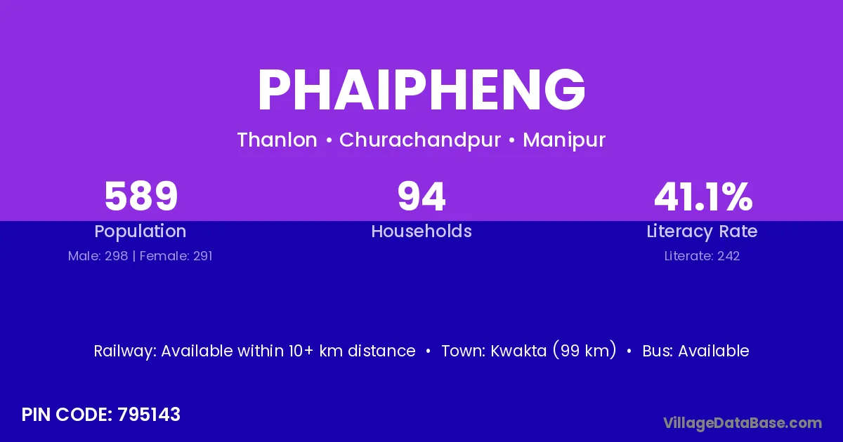 Kwakta (99 km) is the nearest town to Phaipheng village for major economic activities and is located approximately 99 km away.