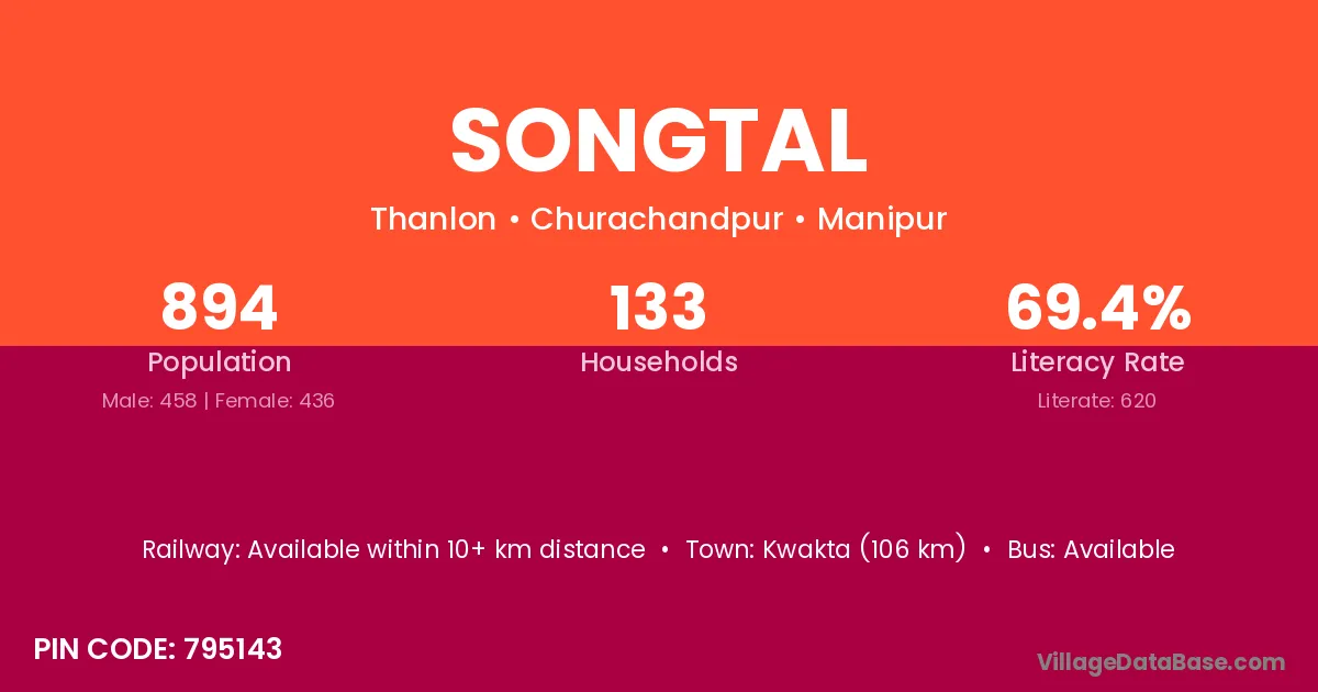 Songtal village has a total population of 894 people, of which 458 are males and 436 are females.