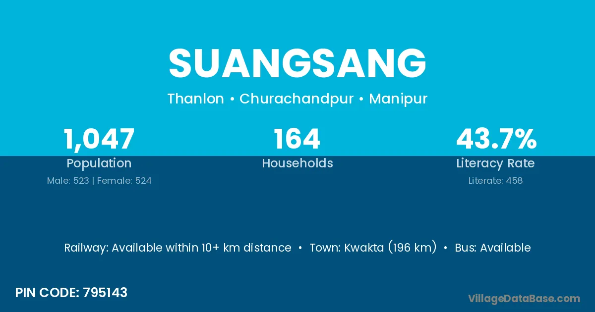 Kwakta (196 km) is the nearest town to Suangsang village for major economic activities and is located approximately 196 km away.