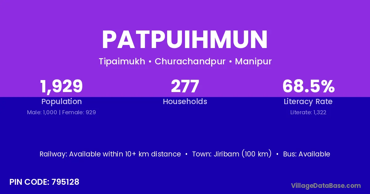 Jiribam (100 km) is the nearest town to Patpuihmun village for major economic activities and is located approximately 100 km away.