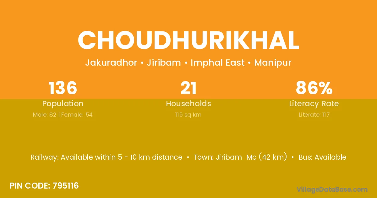 Jiribam Mc (42 km) is the nearest town to Choudhurikhal village for major economic activities and is located approximately 42 km away.