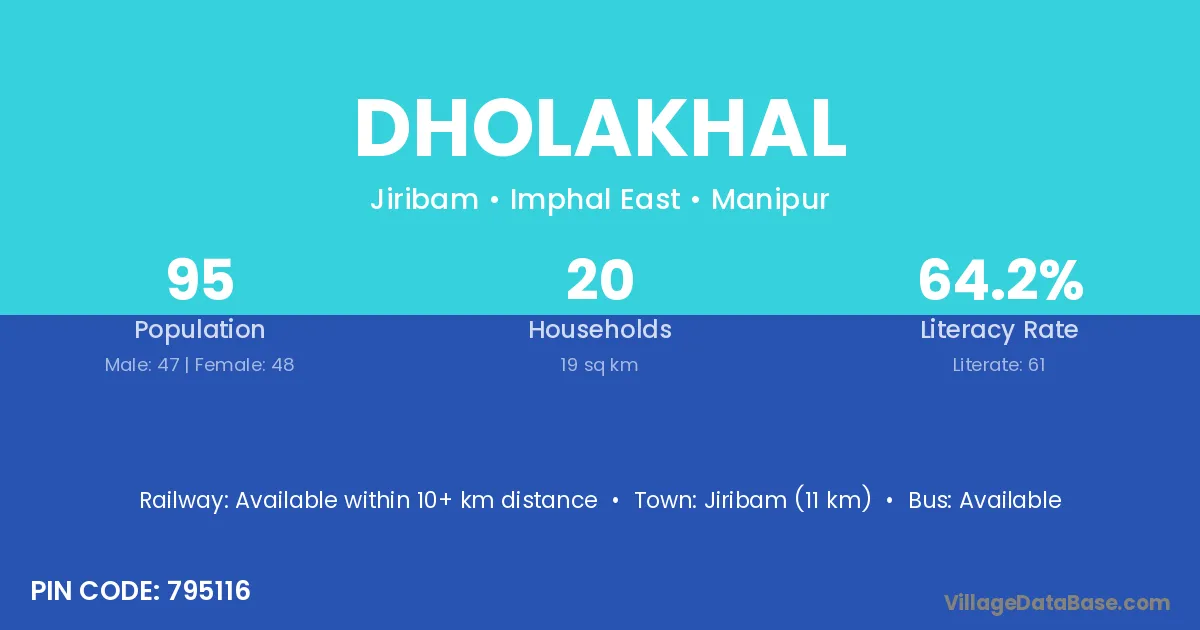 Jiribam (11 km) is the nearest town to Dholakhal village for major economic activities and is located approximately 11 km away.