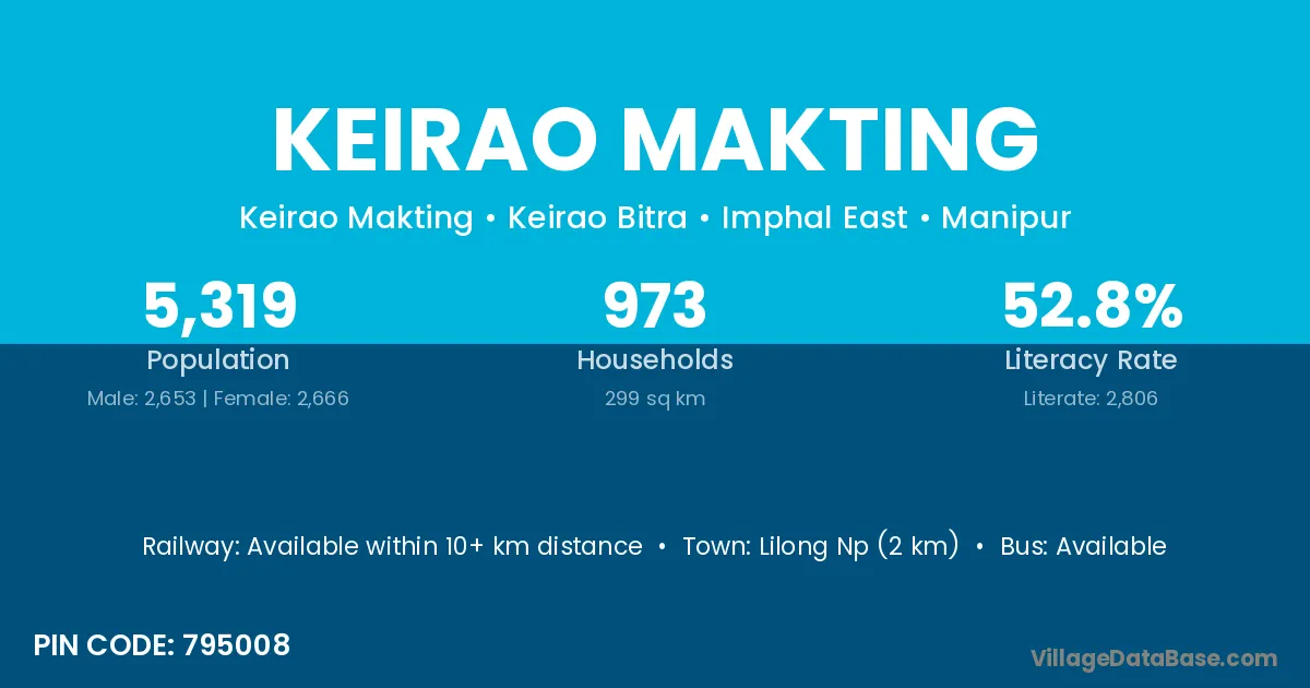Keirao Makting village has a total population of 5,319 people, of which 2,653 are males and 2,666 are females.