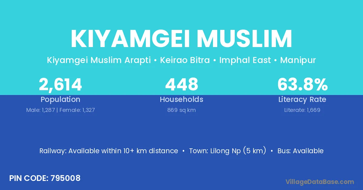 Lilong Np (5 km) is the nearest town to Kiyamgei Muslim village for major economic activities and is located approximately 5 km away.