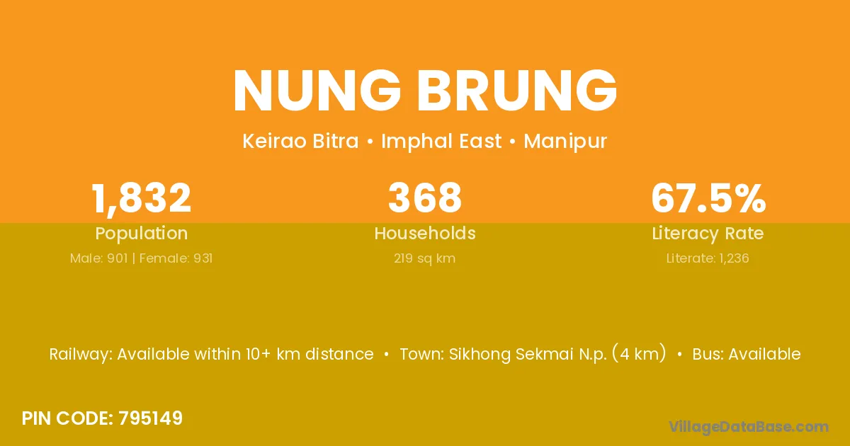 Sikhong Sekmai N.p. (4 km) is the nearest town to Nung Brung village for major economic activities and is located approximately 4 km away.