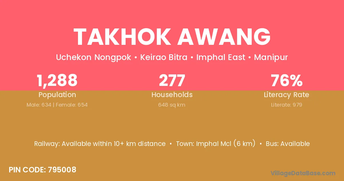 Imphal Mcl (6 km) is the nearest town to Takhok Awang village for major economic activities and is located approximately 6 km away.