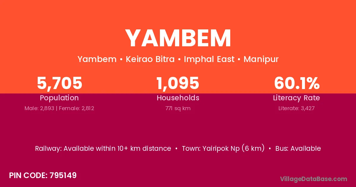 Yairipok Np (6 km) is the nearest town to Yambem village for major economic activities and is located approximately 6 km away.
