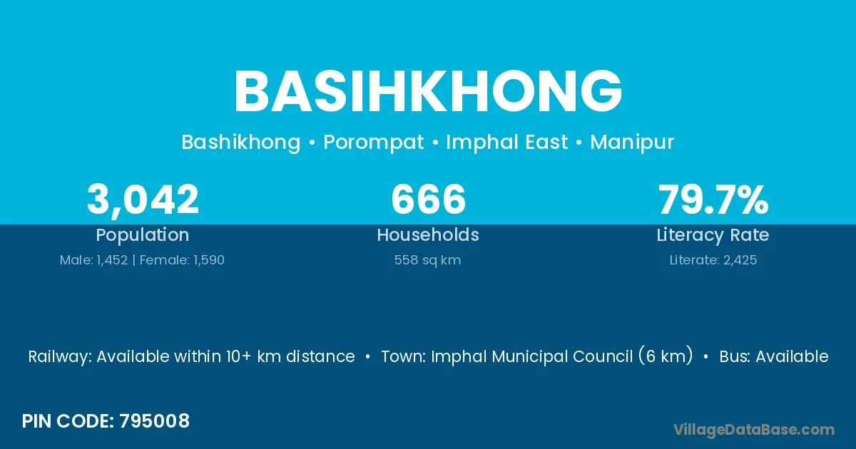 Imphal Municipal Council (6 km) is the nearest town to Basihkhong village for major economic activities and is located approximately 6 km away.