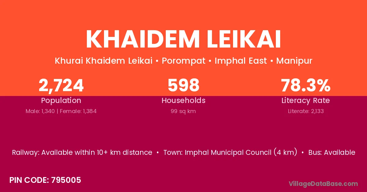 Imphal Municipal Council (4 km) is the nearest town to Khaidem Leikai village for major economic activities and is located approximately 4 km away.