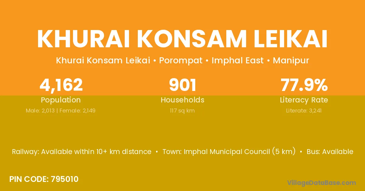 Imphal Municipal Council (5 km) is the nearest town to Khurai Konsam Leikai village for major economic activities and is located approximately 5 km away.