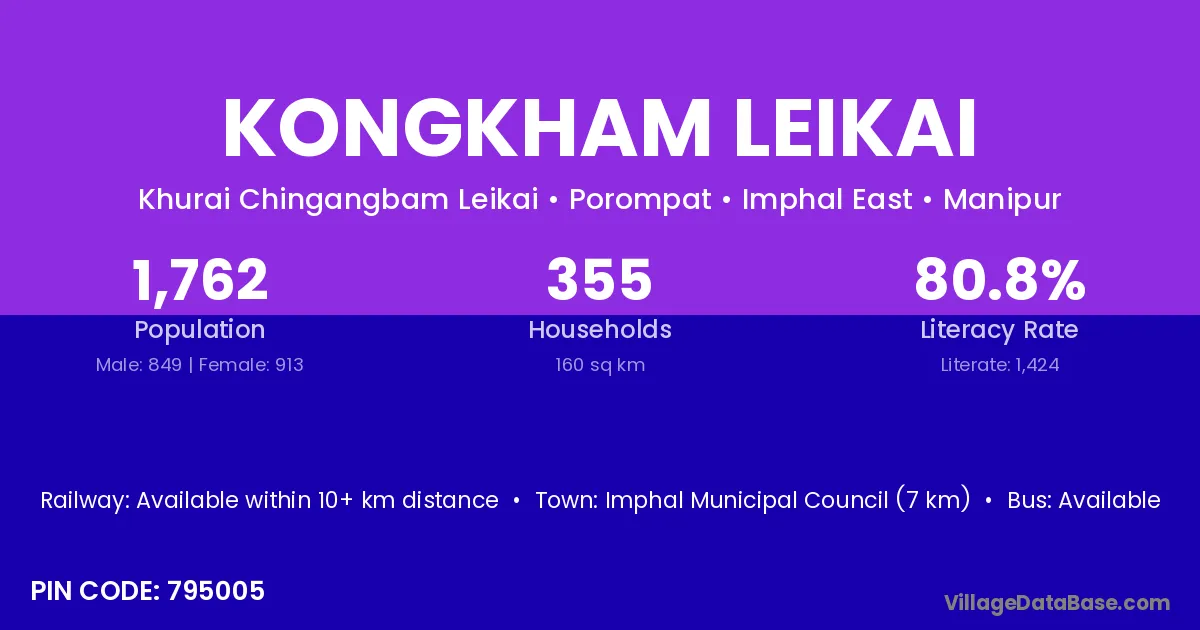 Kongkham Leikai village has a total population of 1,762 people, of which 849 are males and 913 are females.