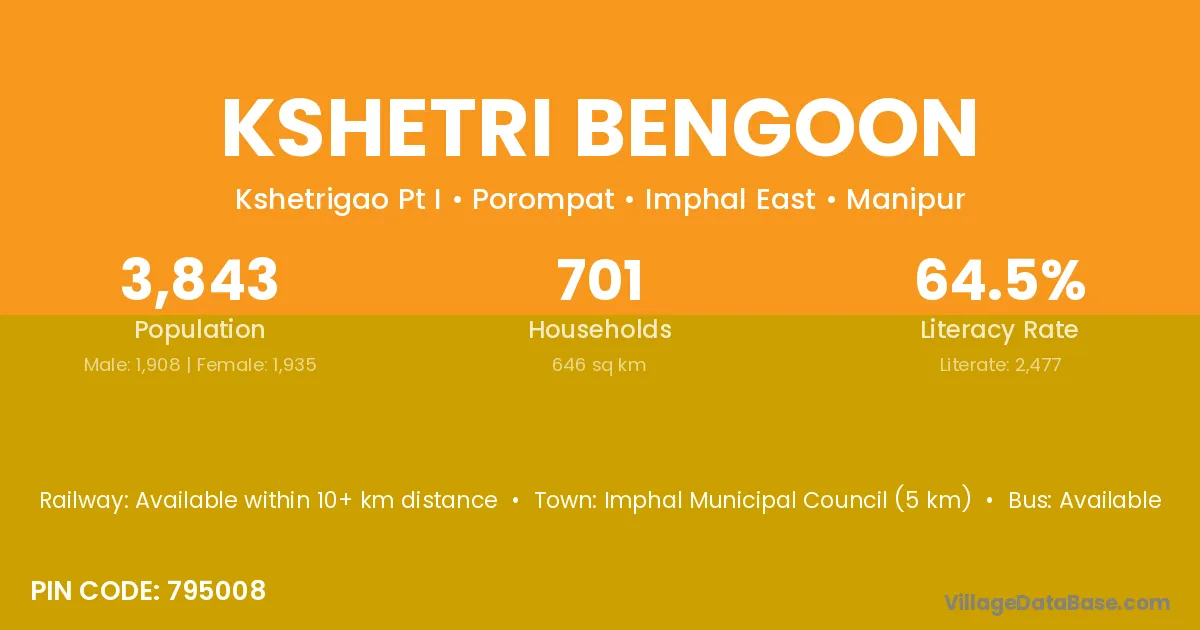 Imphal Municipal Council (5 km) is the nearest town to Kshetri Bengoon village for major economic activities and is located approximately 5 km away.