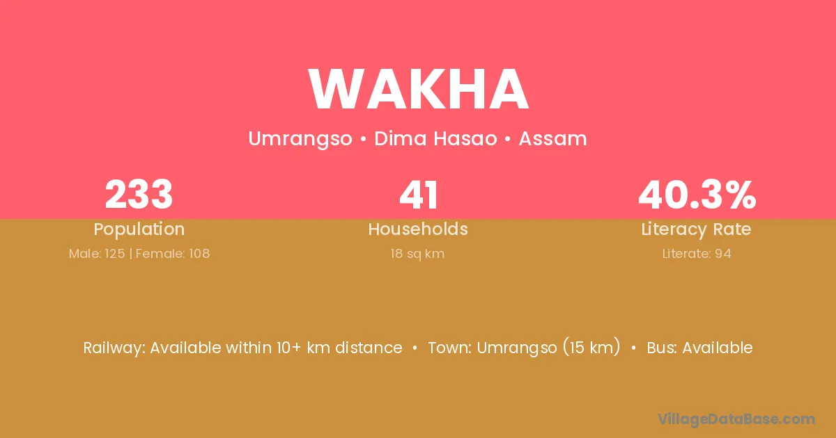 The literacy rate of Wakha village is 41.34%. Male literacy stands at 48.86% and female literacy at 33.33%.