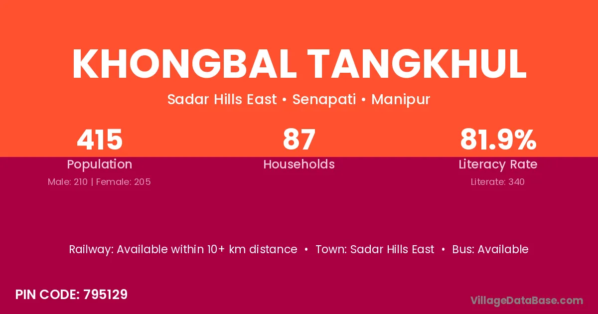 Khongbal Tangkhul village has a total population of 415 people, of which 209 are males and 206 are females.