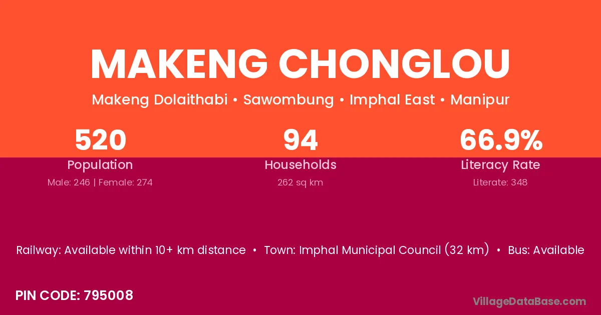 Imphal Municipal Council (32 km) is the nearest town to Makeng Chonglou village for major economic activities and is located approximately 32 km away.
