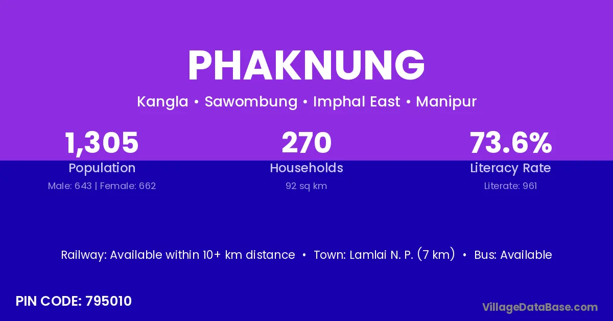 Lamlai N. P. (7 km) is the nearest town to Phaknung village for major economic activities and is located approximately 7 km away.
