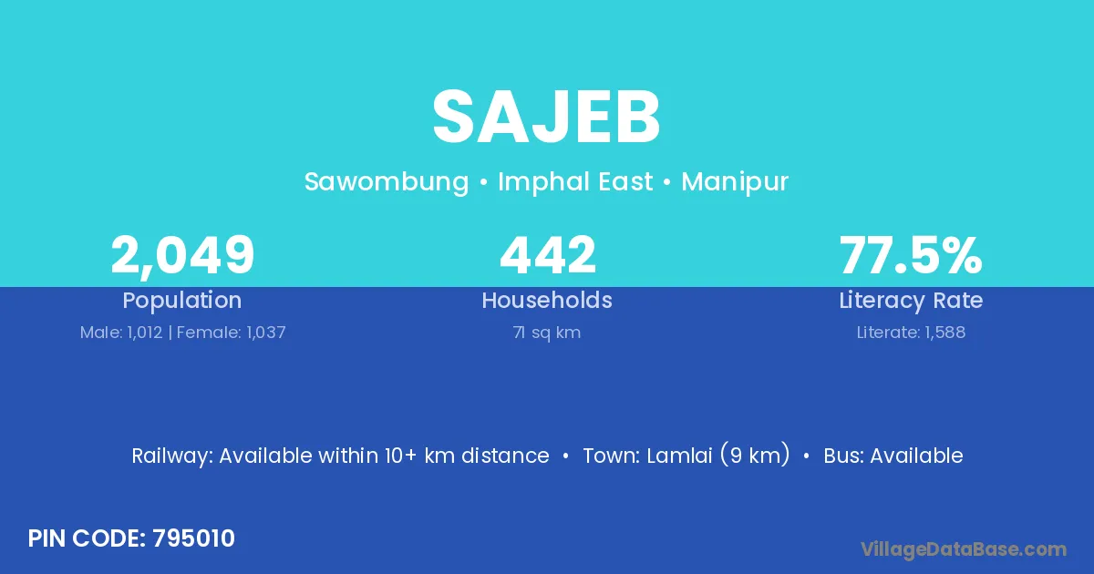 Lamlai (9 km) is the nearest town to Sajeb village for major economic activities and is located approximately 9 km away.