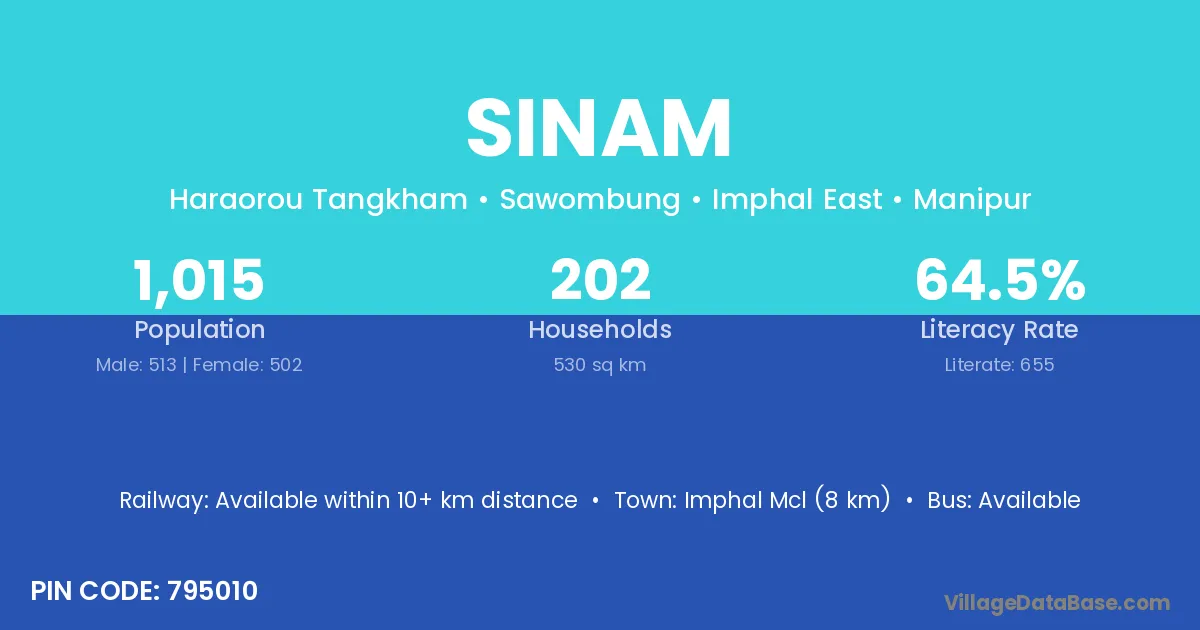 Imphal Mcl (8 km) is the nearest town to Sinam village for major economic activities and is located approximately 8 km away.