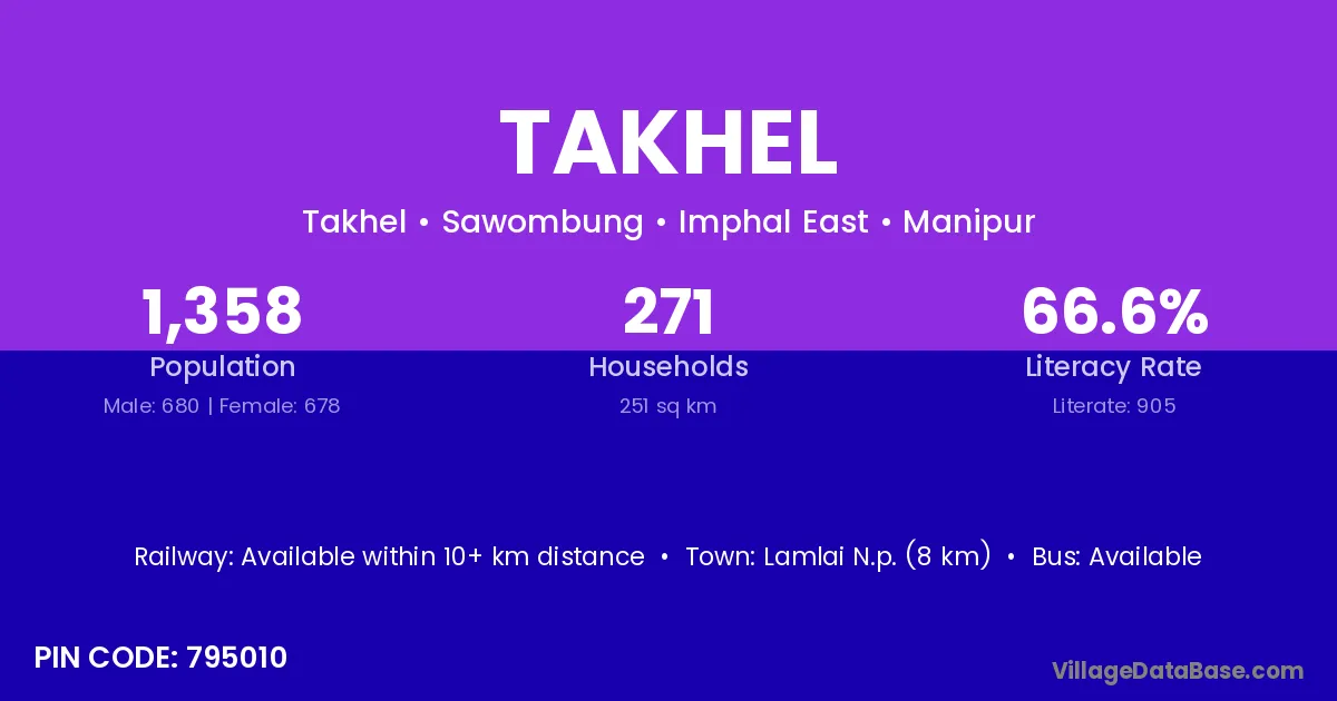 Lamlai N.p. (8 km) is the nearest town to Takhel village for major economic activities and is located approximately 8 km away.