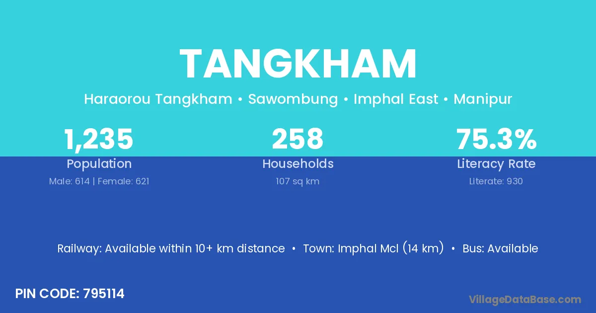 Imphal Mcl (14 km) is the nearest town to Tangkham village for major economic activities and is located approximately 14 km away.