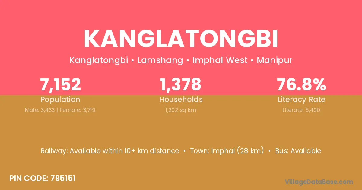 Kanglatongbi village has a total population of 7,152 people, of which 3,433 are males and 3,719 are females.