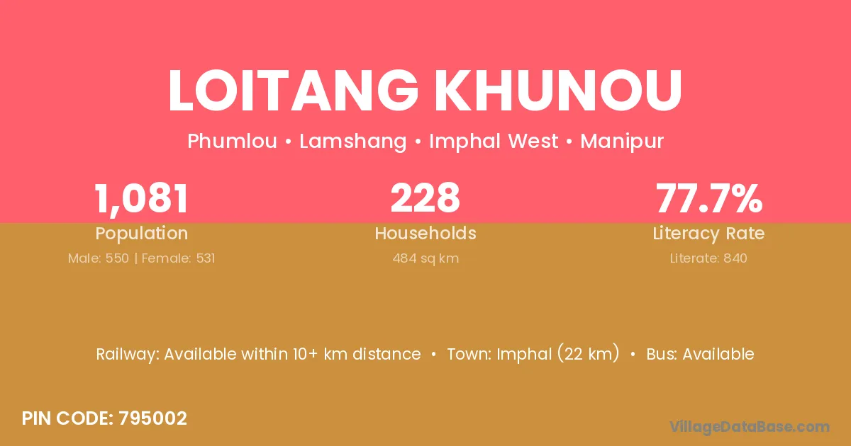 Imphal (22 km) is the nearest town to Loitang Khunou village for major economic activities and is located approximately 22 km away.