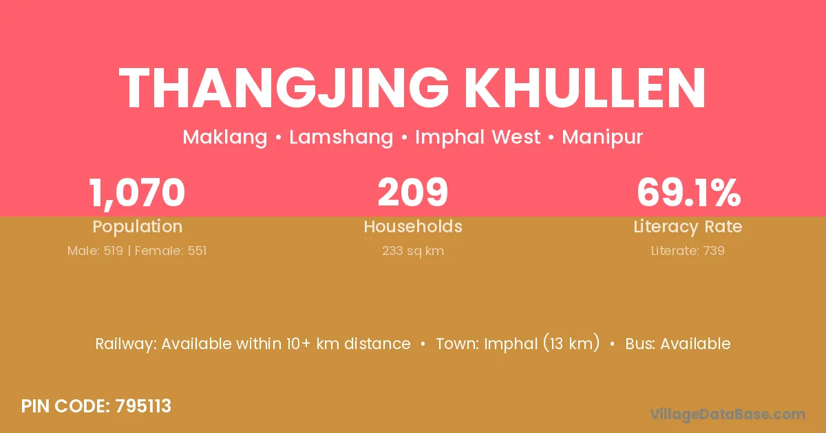 Imphal (13 km) is the nearest town to Thangjing Khullen village for major economic activities and is located approximately 13 km away.