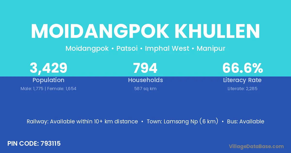 Moidangpok Khullen village has a total population of 3,429 people, of which 1,775 are males and 1,654 are females.