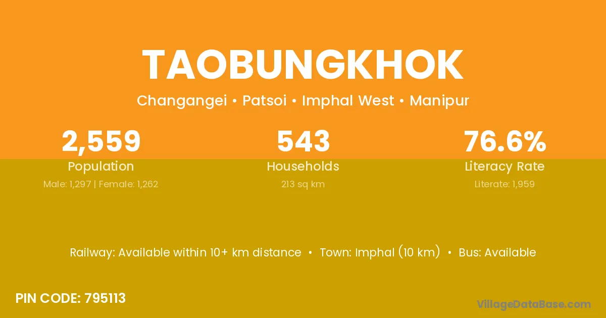 Imphal (10 km) is the nearest town to Taobungkhok village for major economic activities and is located approximately 10 km away.