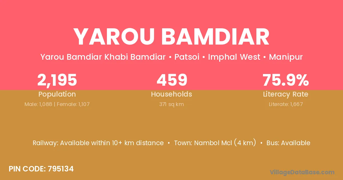 Nambol Mcl (4 km) is the nearest town to Yarou Bamdiar village for major economic activities and is located approximately 4 km away.