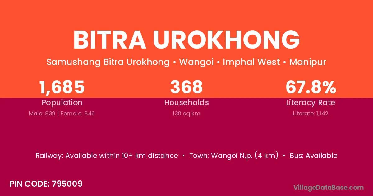 Bitra Urokhong village has a total population of 1,685 people, of which 839 are males and 846 are females.