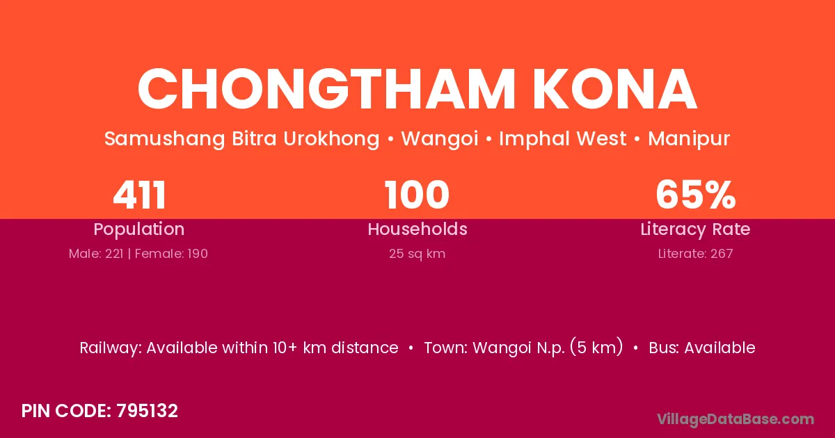 Chongtham Kona village has a total population of 411 people, of which 221 are males and 190 are females.