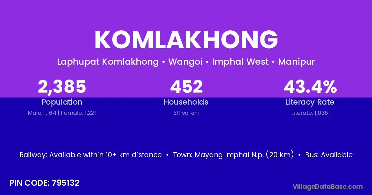 Mayang Imphal N.p. (20 km) is the nearest town to Komlakhong village for major economic activities and is located approximately 20 km away.