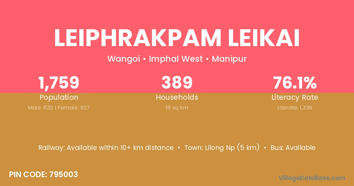 Leiphrakpam Leikai village has a total population of 1,759 people, of which 832 are males and 927 are females.