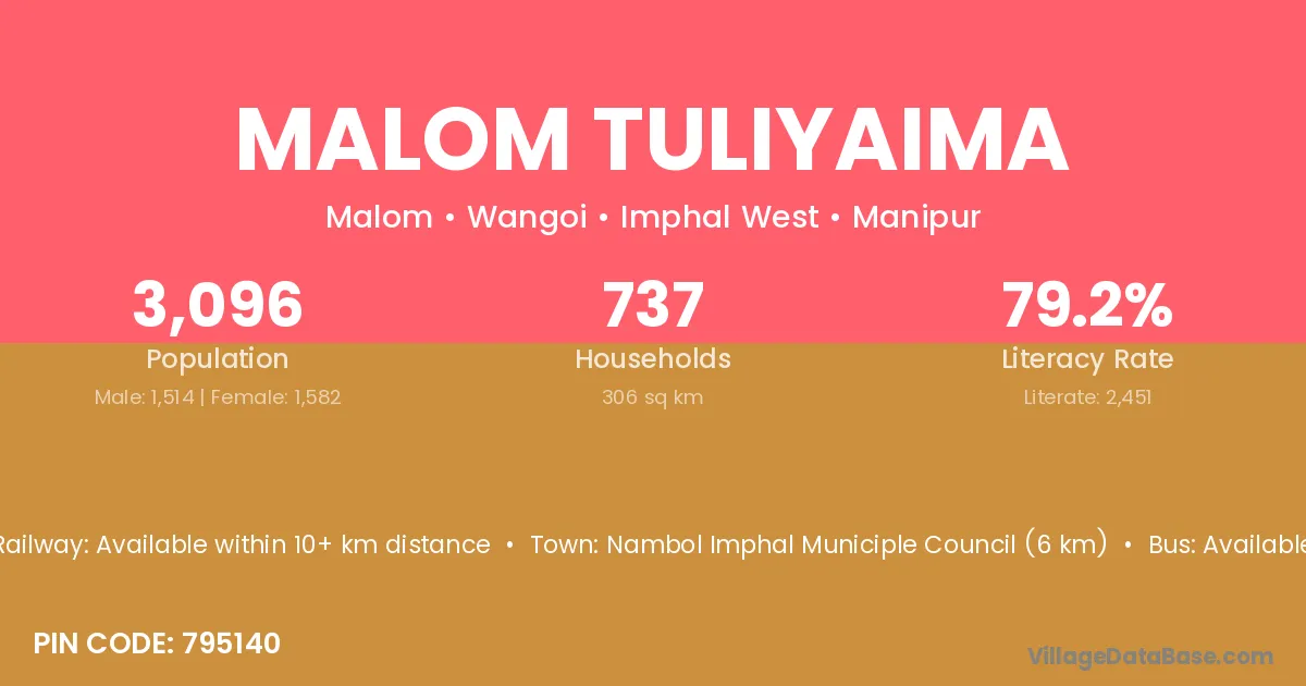 Nambol Imphal Municiple Council (6 km) is the nearest town to Malom Tuliyaima village for major economic activities and is located approximately 6 km away.