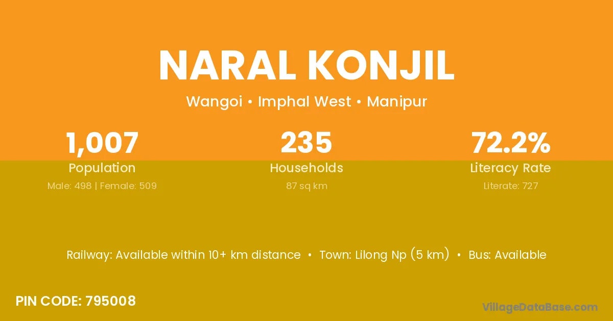 Lilong Np (5 km) is the nearest town to Naral Konjil village for major economic activities and is located approximately 5 km away.